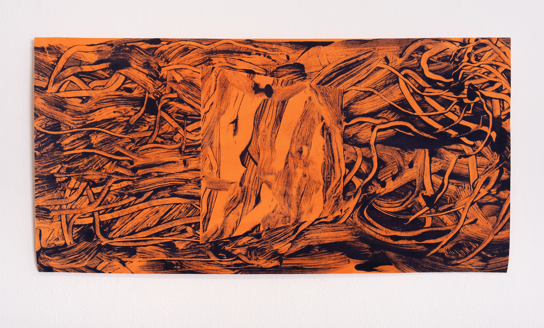 Utan titel, 2024. Acrylic on cotton/silk, monoprint on a painted base. 94 x 127cm